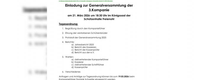 Von Pressewart|2026-02-23T12:47:11+02:0023. Februar 2026|3. Kompanie, Bruderschaft|Kommentare deaktiviert für Einladung zur Generalversammlung der Dritten Kompanie am 21.03.2026