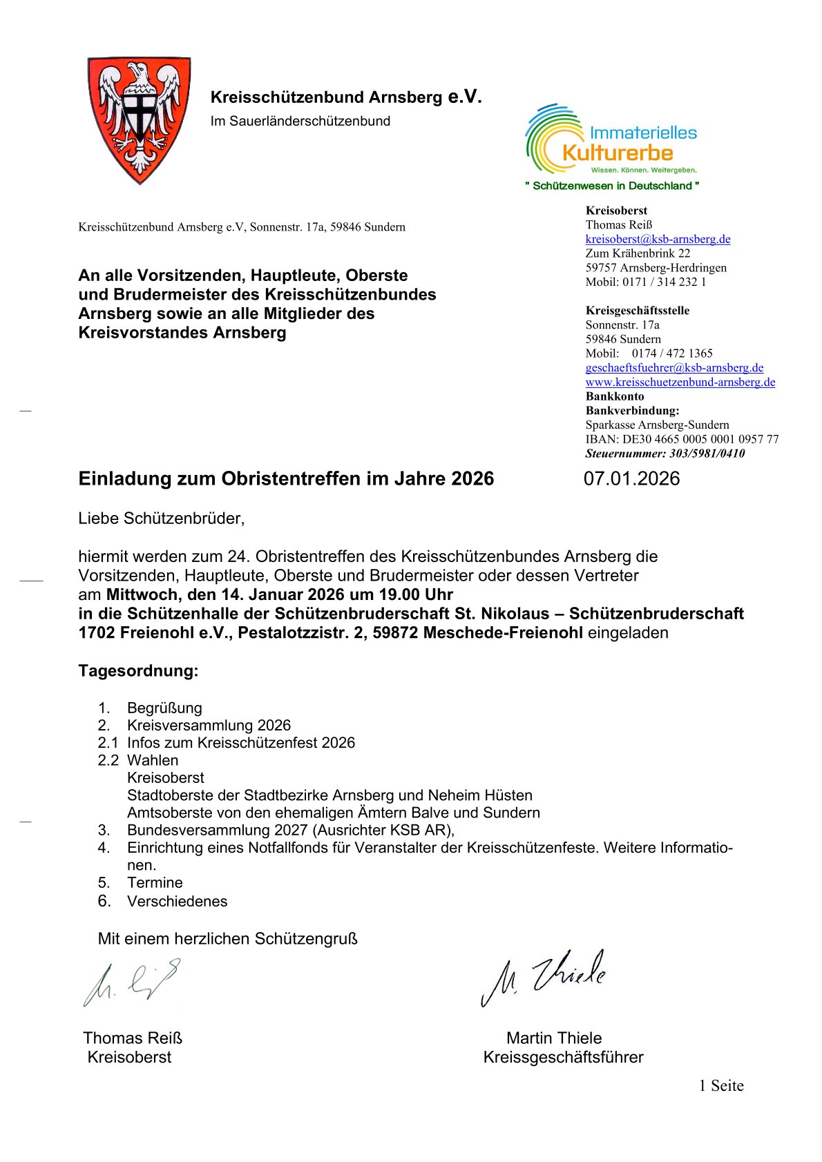 Wir freuen uns, Euch im Namen des Kreisschützenbundes Arnsberg e.V. gute Gastgeber sein zu dürfen und heißen alle Vertretenden der Gastvereine aufs Herzlichste willkommen.