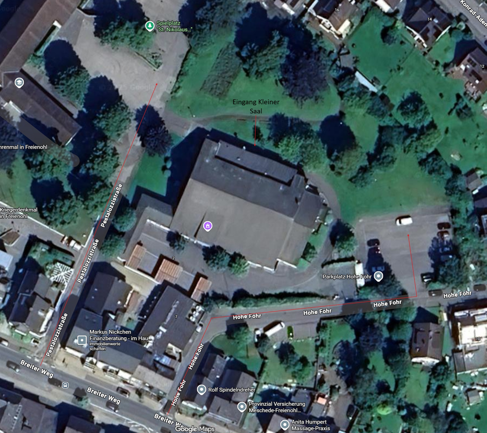 Zum Parken nutzt bitte die Parkplätze auf dem Schulhof und auf dem Parkplatz Hohe Fohr. Die Veranstaltung findet im Kleinen Saal/Speisesaal der Schützenhalle statt (siehe eingezeichneten Eingang).