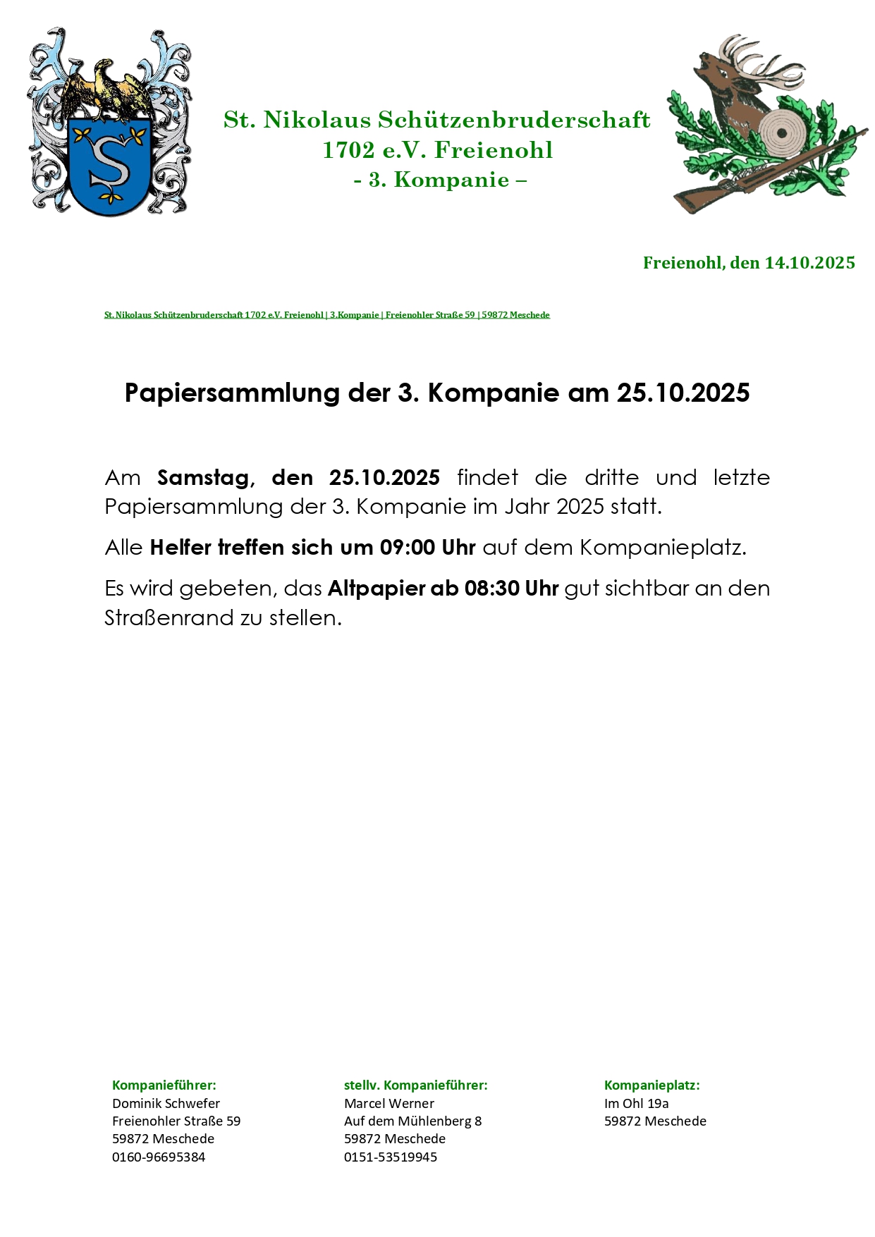 Papiersammlung der Dritten Kompanie am 25.10.202 Von Pressewart|2025-10-15T14:57:12+02:0015. Oktober 2025|Bruderschaft|Kommentare deaktiviert für Papiersammlung der Dritten Kompanie am 25.10.202 Teilen Sie diesen Artikel! FacebookXRedditLinkedInWhatsAppTelegramTumblrPinterestVkXingE-Mail Über den Autor: Pressewart Ähnliche Beiträge Generalversammlung der Bruderschaft am 02.11.2025 Gallerie Generalversammlung der Bruderschaft am 02.11.2025 Terminabsprache zum Veranstaltungskalender am 03.11.25 um 19.00h Gallerie Terminabsprache zum Veranstaltungskalender am 03.11.25 um 19.00h Wir haben eine Regionalkönigin – Ab Montag geht es in den Endspurt!! Gallerie Wir haben eine Regionalkönigin – Ab Montag geht es in den Endspurt!! Seniorennachmittag und Kompanieabend der Dritten am 26.09.25 Gallerie Seniorennachmittag und Kompanieabend der Dritten am 26.09.25