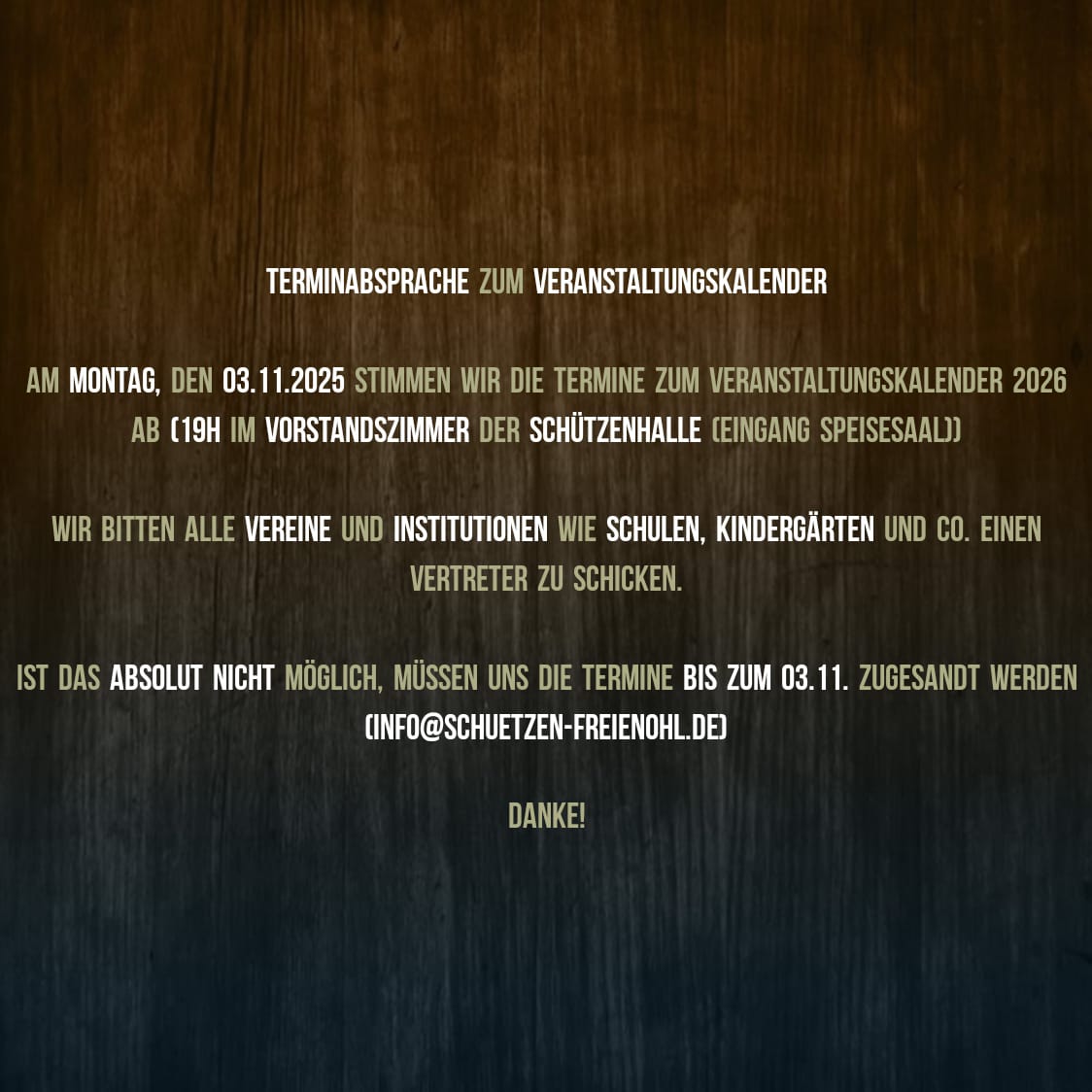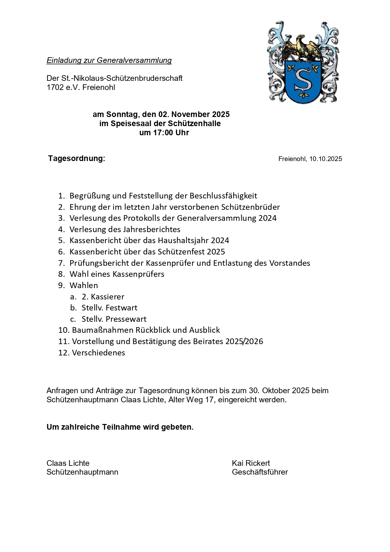 Schützenfest in Olpe Am Pfingstsamstag, den 04.06.22 besuchen wir das Olper Schützenfest. Alle Schützen bitte ab 19.45h an den Freienohler Bushaltestellen stehen. Anzugsordnung ist Uniform mit schwarzer Hose und ohne Hut. Von Pressewart|2022-05-31T06:50:35+02:0031. Mai 2022|1. Kompanie, 2. Kompanie, 3. Kompanie, Bruderschaft, Kompanien, Schießsportgruppe|Kommentare deaktiviert für Schützenfest in Olpe Teilen Sie diesen Artikel! FacebookXRedditLinkedInWhatsAppTelegramTumblrPinterestVkXingE-Mail Über den Autor: Pressewart Ähnliche Beiträge Generalversammlung der Bruderschaft am 02.11.2025 Gallerie Generalversammlung der Bruderschaft am 02.11.2025 Papiersammlung der Dritten Kompanie am 25.10.202 Papiersammlung der Dritten Kompanie am 25.10.202 Terminabsprache zum Veranstaltungskalender am 03.11.25 um 19.00h Gallerie Terminabsprache zum Veranstaltungskalender am 03.11.25 um 19.00h Wir haben eine Regionalkönigin – Ab Montag geht es in den Endspurt!! Gallerie Wir haben eine Regionalkönigin – Ab Montag geht es in den Endspurt!!